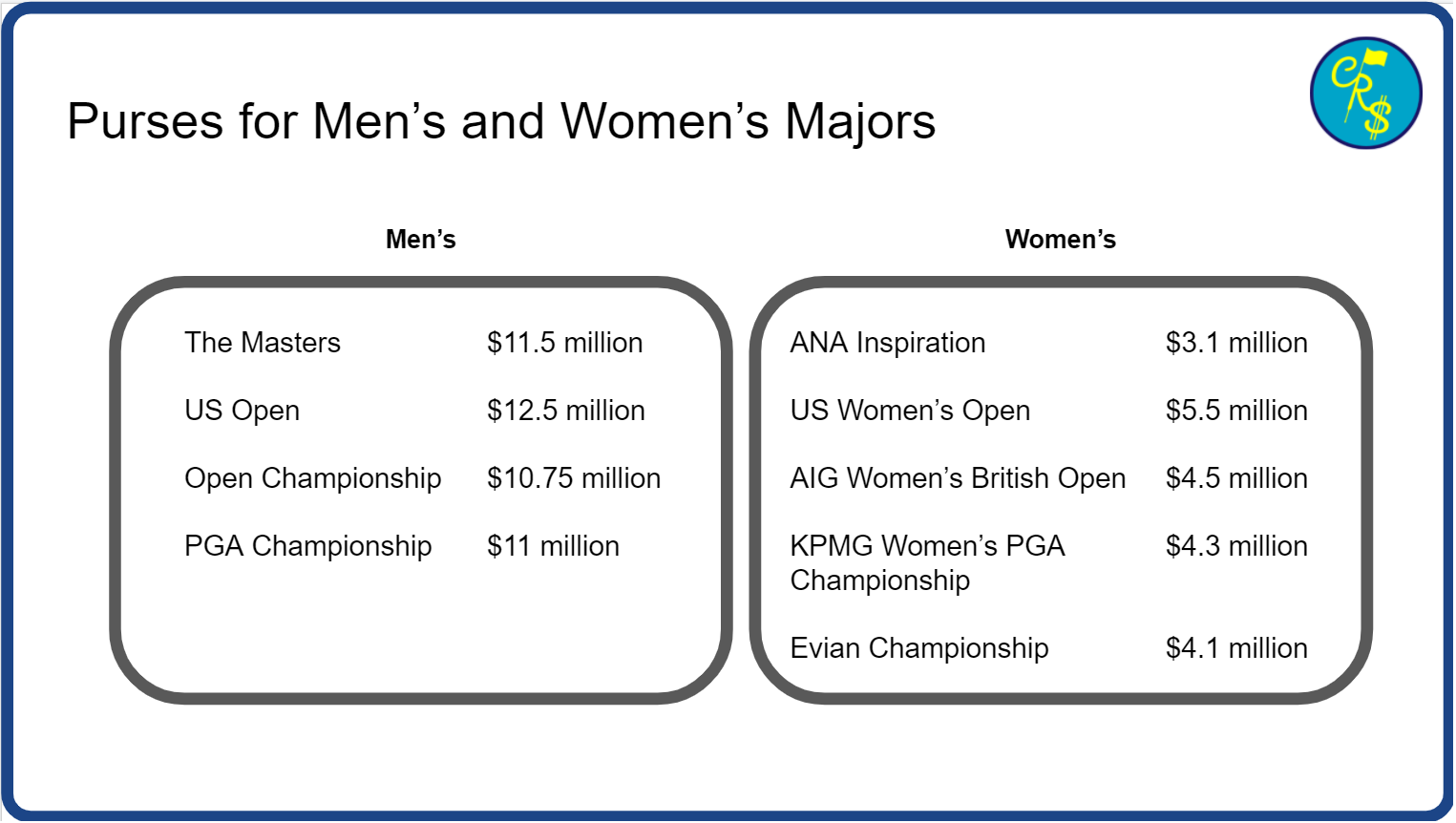 Golf on the other hand doesn't have that. Right? So the USGA, for example, they put on the Men's US Open and the Women's US Open. The Men's US Open is inherently more valuable to them than the Women's US Open. It just is for the money that they make from a corporate perspective, from TV and whatnot. So their argument is, well, they make more money. And so, now that's the real answer.